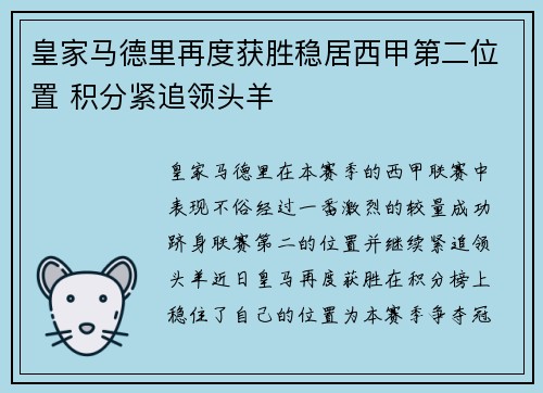 皇家马德里再度获胜稳居西甲第二...